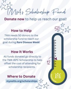 Attending TMA’s International Annual Patient Conference is a life-changing experience for those living with myositis and their families, providing education, support, and a sense of community. This year for Rare Disease Week, February 24-28, 2025, our goal is to bring together 50 donors and raise $5,000 to provide conference scholarships. Your donation, no matter the size, helps bring hope and connection to patients who need it most. Give today and help us reach our goal.